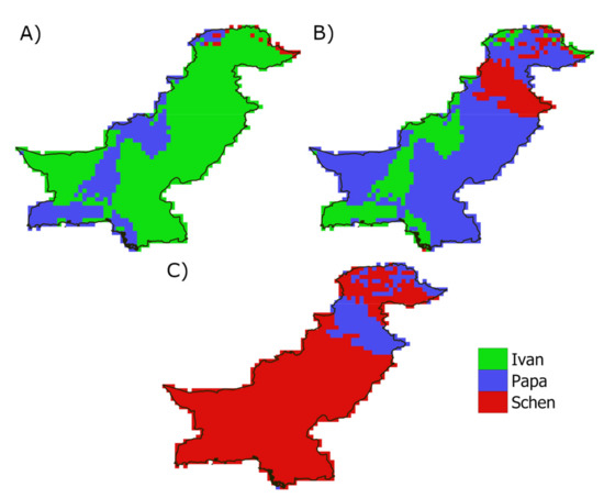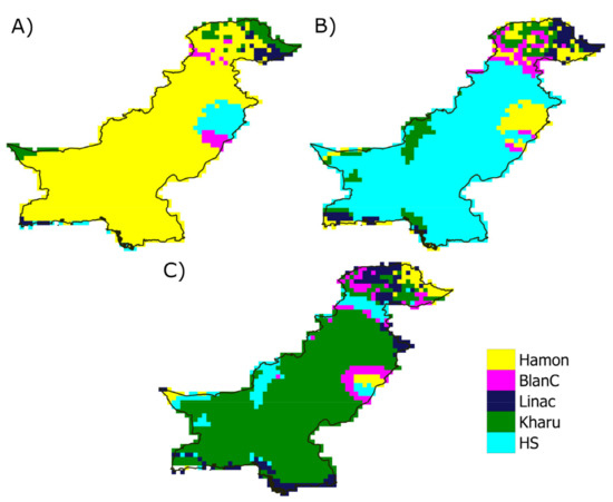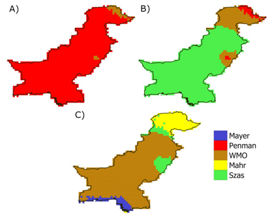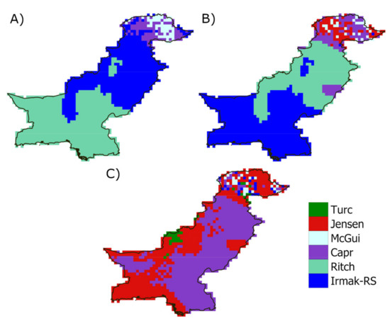 Spatial distribution of ET models ranked (A) first, (B) second and (C) third at different grid points over Pakistan.