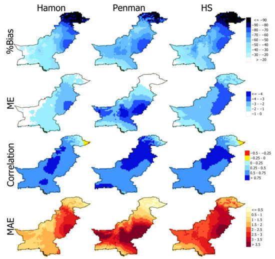 Hamon provides the best estimation of ET in Pakistan, but it underestimates ET all over the country, except in the far west. McCabe et al. [119] also showed an underestimation of ET using the Hamon method over the United States, except in the country’s southwest. They proposed calibration of the Hamon model for the region of interest to enhance the model performance. This can be recommended for future work.