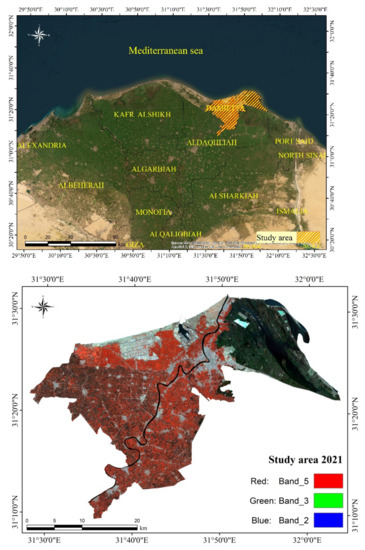 The data used in this study included three free downloadable images (http://glovis.usgs.gov/ accessed on 28 April 2001); Landsat 5 Thematic Mapper data as TM 5 acquired in 28 April 2001, Landsat 7 Enhanced Thematic Mapper Plus as ETM 7+ in 13 July 2011 and Landsat 8 Operational Land Imager data as OLI in 21 May 2021. All images were referenced using the UTM system, zone 36 N. ENVI (5.3) software was used in this study for data processing, while ArcGIS (10.4.1) was used for mapping the Land Use/Cover maps. Maximum Likelihood Classifier was used in this investigation Field validation visits were elaborated to confirm the accuracy of classification. Land cover classification was assessed by the land classification system (LCCS) as reported and proposed by [25].