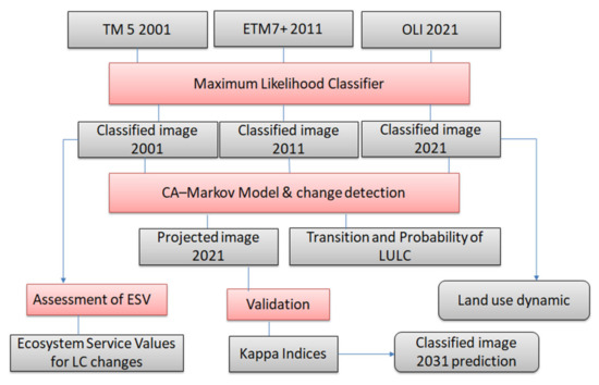 where ESVf is the function type “f” value of the ecosystem service “ESV” which is the total ecosystem service value in the study area; Ui is the area for land use category, I VCif is the value of the coefficient of ecosystem service function type “f” for land use category I, “Ai” for “average land type” (ha). Wherever: ESV is the total value of ecosystem services (USD); Ai is the land type average (ha); VCi refers to the ecosystem services of land type per unit area (USD·ha−1·y−1). Ten ESVs were selected in the current study, as shown in Table 2, which are raw materials production (RMP),food production (FP), climate regulation (CR), gas regulation (GR), waste treatment (WT), culture and recreation (C&R), hydrological regulation (HR) and soil conservation (SC), as recorded by [29]. The flow chart showing the methodology adopted in the present study to assess the LULC changes, ESV and for LULC 2032 is shown in Figure 2.