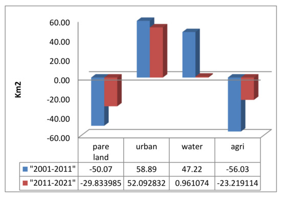 In the present study, LC changes were monitored from the years 2001 to 2021 in two different durations; 2001–2011 and 2011–2021. Further, prediction of future changes of LULC in 2031 was assessed. The study area is subjected to temporal changes during the period of study (2001–2021). Total areas and the percentage of each LC class are illustrated in Table 3. During 2001–2011, a significant decrease was recorded in the cultivated areas (−56.03 km2) and bare areas (−50.07 km2), while the urban area and water bodies were increased (58.89 km2, 47.22 km2), respectively as shown in Figure 3.