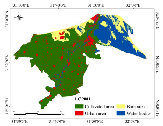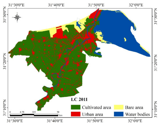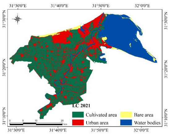 The Maximum Likelihood Classifier was used in this investigation to produce LULC maps because it is the most accurate classifier and the most important type of supervised classification [32,33]. The planned urbanization and the unplanned urban sprawl represented the main processes inducing the increase in the residential area. Thus, urban sprawl in the study area occurred on account of the agricultural land. However, the development that considered the conservation of the land resources was planned on the available bare lands that are not utilized [34]. Water bodies attained a non-significant increase during the investigated period. According to [35,36], due to the developmental projects, agricultural lands can increase the value of the ecosystem.