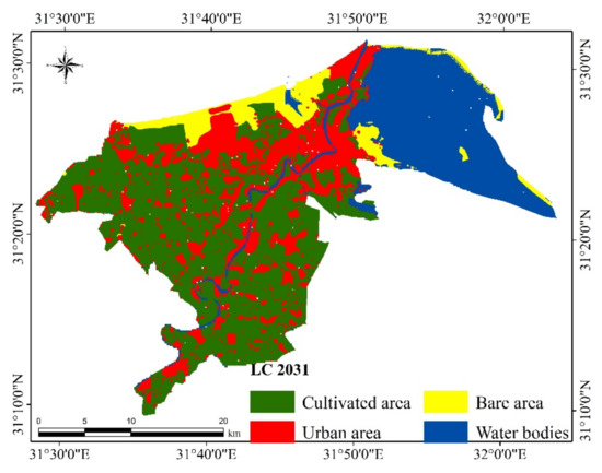 During 2011–2021, expansion in urban (52.09 km2) and water bodies (0.96 km2) were occurred on the expense of the bare area (−29.83 km2) and cultivated area (−23.22 km2). Figure 4, Figure 5 and Figure 6 show the land cover of 2001, 2011, and 2021. The prediction of the LULC was achieved using Cellular automata (CA) and the Markov model for 2031 as presented in Figure 7. The results indicated that there are decreases in the cultivated area and water bodies, while there are increases in the urban area and bare area. The cultivated area will decrease to reach 46.22% of the total area based on the presented results. The urban area will increase to 22.82% of the total area with a non-significant decrease in the water bodies to represent 24.13%. Table 4 showed the changes in LU/LC from 2001 to 2031.
