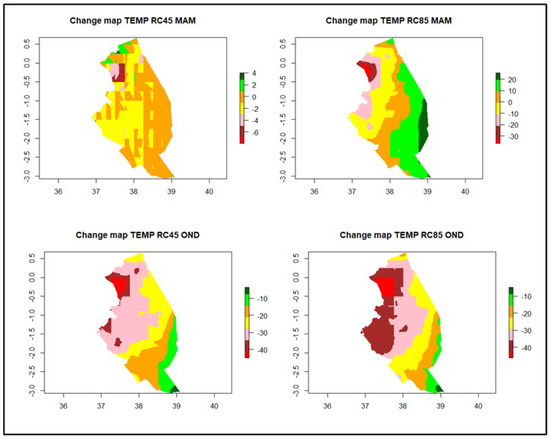 Temperature was adjusted to thermal regimes by adding a threshold to allow for adjustment of temperatures that fall below the minimum needed for crop growth [26]. Increasing temperature was observed across the region, with higher increases observed in the lower eastern part, but more pronounced increases in MAM than in OND, as seen in Figure 3. This is consistent with the consensus on projections that suggests changes in temperature point to a warmer future over almost all parts of Kenya. In the near future, the annual surface temperature is projected to increase by between 1.0 °C and 2.0 °C under the RCP4.5 scenario, but will likely be greater in the RCP8.5 scenario, which is expected to be between 1.5 °C and 2.5 °C [15]. Most of the change in thermal regimes was observed from the lowland regions in Machakos and in the highland areas of Tharaka Nithi and Meru, with the change pronounced in both MAM and OND.