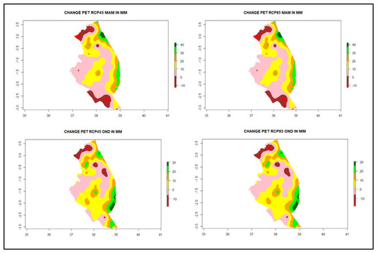 An increase in PET adversely affects agriculture, as more water is lost to evaporation and transpiration. An increase in PET was observed across the study area, with a more pronounced increase in RCP 8.5 than in 4.5, as seen in Figure 4. The highest increases were observed in already constrained areas, such as Embu, Tharaka Nithi, North Meru and the lower sides of Kitui.