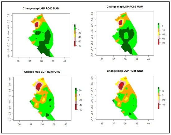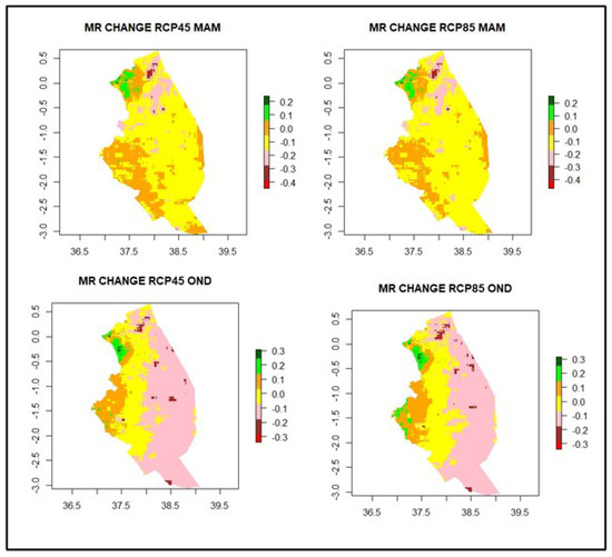 To capture micro-variations, all layers were acquired at a scale of 1 km or less where possible. Fuzzy logic was used to normalize the outputs. Change was determined from the 2020 baseline assessments and the 2040 predictions by season (MAM and OND). From the assessment, the expected climate shifts and increase in precipitation was observed, with higher gains observed during OND than MAM. This corresponds to RCMRD’s [15] assessment that future seasonal rainfall will likely increase during OND under all scenarios, with greater increase over eastern parts of Kenya, as shown in Figure 2.
