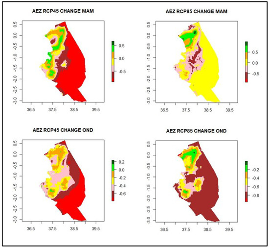 Climate regimes and biophysical parameters were normalized using fuzzy logic and used as inputs to the definition of the AEZ. Linear and inverse relationships were applied based on the variable’s contribution to agriculture potential. An inverse relationship applies in the interpretation of AEZ change maps. For example, a change from 7 (per-arid) to 6 (arid) represents improved potential. The highest losses in potential of the agro-ecologies were observed around Machakos, Embu, Meru and Tharaka Nithi and were more pronounced in RCP 4.5 MAM than in RCP 8.5 MAM (see Figure 10). Improvements in AEZ were more notable during the OND for both RCPs in the lower eastern region, corresponding with the noted increase in rainfall and length of the growing period.