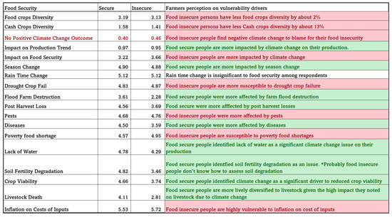 An understanding of perceptions of drivers to vulnerability was found to be different between food-secure and food-insecure respondents. An assessment of the education levels of the respondents did not seem to affect their perceptions of their sensitivity to climate change. However, there were distinct variations in the definitions of the responses from food-secure and food-insecure households (Figure 15). For example, food-secure households responded that they were more affected by farm destruction by floods and post-harvest losses than drought, poverty or inflation. This implies that, in food-secure areas, management of post-harvest losses was more important as well as mitigation of flood-related destruction.