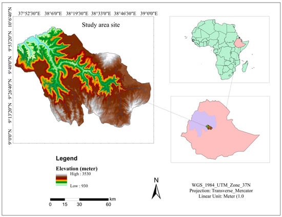 The Muger Sub-basin is located in Oromia regional state, Ethiopia. The absolute location of the study area is between 9° 05′18.7″–10°01′21.7″ N latitude and 37°44′29.77″–39°01′6.7″ E longitude. Topography of the study area varies between 930 and 3530 meter above sea level (Figure 1). The study area covers about 8188 km2. The study area temperature is warm to hot. The mean maximum temperature is between 16 and 31.5 °C, while the mean minimum temperature varied from 3 to 16.5 °C [,]. The annual rainfall around Muger Sub-basin is between 833 and 1326 mm. Leptosols and Luvisols are the most dominant soil types in Muger Sub-basin. Other common soils occurring in the study area includes Cambisols, Nitosols, and Rigosols [,].