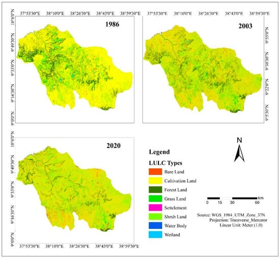 LULC map of Muger Sub-basin in 1986, 2003, and 2020 adapted from [].