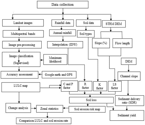 The revised universal soil loss equation (RUSLE) model has the capacity to calculate the amount of soil loss over particular area or region []. This model considers a real situation at watershed level [,]. The RUSLE is easy to use under data deficient and applicable at different scale [,,,,,,,,]. Five key parameters namely: rainfall erosivity, soil erodibility, slope length and steepness, cover management, and conservation practices were required to calculate soil loss and sedimentation using RUSLE model as indicated in Equation (1). The overall methodology used for annual soil loss estimation is demonstrated in Figure 3.
