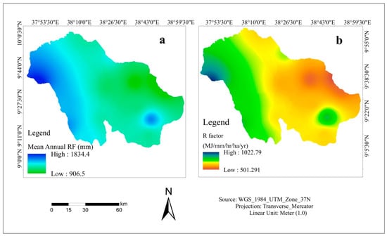 Mean annual Rainfall (mm) (a) and Rainfall erosivity (R) factor (b) of the Muger sub-basin.