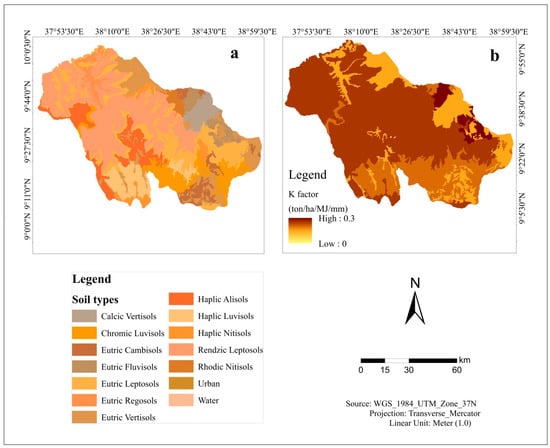 Map of soil types (a) and Soil erodibility (K) factor (b).