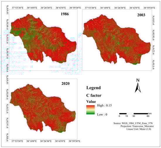 Soil erosion by water is more common in locations where vegetation is limited, while lower around high vegetation cover []. The C-values (Table 4) were allocated for different LULC class based on scientific literature [,,,,,,]. Cultivated land, forest land, grassland, settlement, and shrub land C-factor values were compiled from [,], for water bodies and wetland were adapted from [,,] and for bare land was adapted from [,,]. The C factor maps of 1986, 2003 and 2020 is illustrated in (Figure 7).