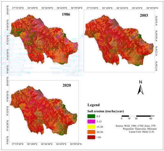 Soil loss (ton/ha/year) in 1986, 2003, and 2020.