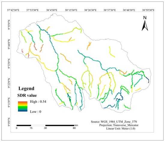 Sediment delivery ratio (SDR) is calculated by using different parameters such as; channel slope, stream density, LULC, sediment source, and rainfall-runoff []. The work followed a method proposed [] (Equation (4)). The SDR equation have been widely used fin the northwestern parts of Ethiopia, with reasonable forecast results [,,]. The SDR is also utilized in other countries; Irga watershed in Jharkhand, India [,]; Kalu Ganga basin, Sri Lanka [,], and in Sebeya watershed in Congo river, Congo []. In this study, SDR was determined by adopted the model developed by [] using Equation (4).