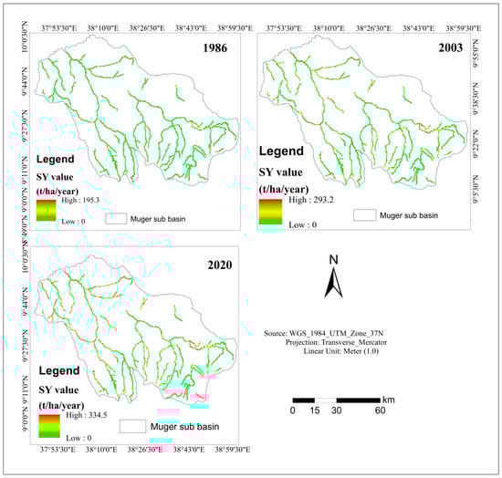 Sediment yield is a function of sediment delivery ratio and gross erosion []. Three SY raster grids were calculated for the years 1986, 2003, and 2020, assuming that LULC changes have an impact on sedimentation []. The SY value for the three-time period is calculated using Equation (6).