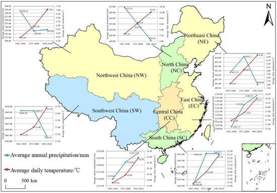 Changes in average annual precipitation and average daily temperature in three basic climatic periods in different regions of China.