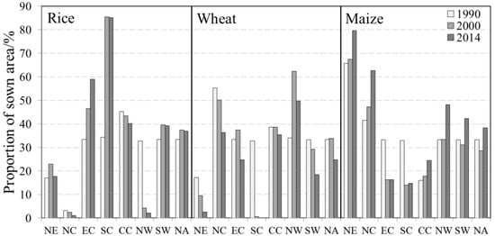 Changes in rice, wheat and maize sown area proportions in different regions of China in 1990, 2000 and 2014.