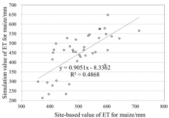 Comparison of site-based value and simulation value of evapotranspiration for maize.
