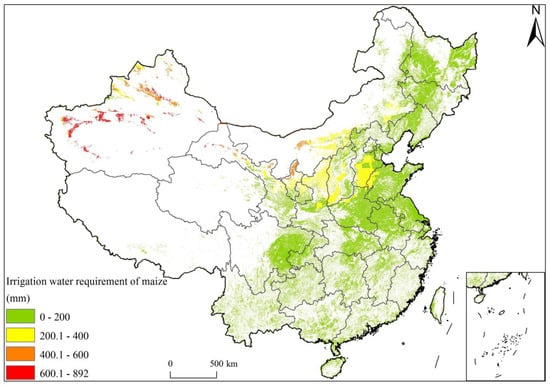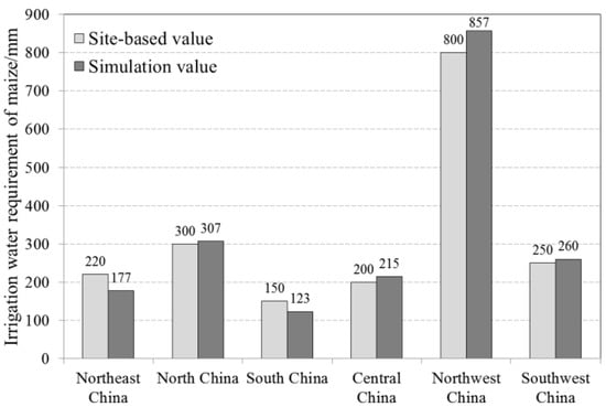 To verify the applicability and accuracy of the model, we verified the evapotranspiration results of the model using meteorological site monitoring data. From the scatter diagram in Figure 3, it can be seen that the simulation value is positively correlated with the site value, and the spatial distribution is consistent. Thus, the simulated value can accurately reflect the real level of crop evapotranspiration in China. Simultaneously, we compared the maximum IWR calculated based on the site data in the literature [] with the maximum IWR simulated by the China-AEZ model. Because rice can be divided into early, middle and late rice, the growth period of different rice types is different; thus, the IWR varies greatly. Additionally, the IWR of wheat has not been obtained nationwide; thus, we compared the IWR of maize in the 7100 period (Figure 4). We found that the relative error was less than 20% between the site-based value and our simulation results. Among them, the simulation values of north China, southwest China, northwest China and central China are much higher, which are 2.33%, 4.00%, 7.13% and 7.50% higher, respectively. The simulation values of south China and northeast China were lower by 18.00% and 19.55%, respectively. The simulated crop IWR was not used for the analysis of the absolute value; the key point was to compare among different periods, so the simulation accuracy of the model met our research requirements.