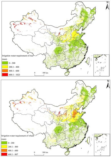 China Agro-Ecological Zones model (China-AEZ) is based on the Global Agro-Ecological Zones model (Global-AEZ), while the parameters are all revised locally for China []. The main parameters of the China-AEZ model and its simulation results have been calibrated and validated []. Crop IWR is derived from crop water demand minus effective precipitation; thus, the calculation of crop water demand is the basis for calculating crop IWR. Crop water demand can be calculated by the energy balance method, micrometeorology method, soil water balance method, and yield and evaporation estimation method [,,,]. The above methods have different principles and limitations and have not been widely used in practice. Therefore, this study uses the method of the China-AEZ model to calculate crop water demand, which is embedded with the meteorological data method recommended by the Food and Agriculture Organization of the United Nations (FAO). The actual evapotranspiration of crops is calculated by crop coefficient and reference crop evapotranspiration. Among them, reference crop evapotranspiration is calculated by Penman–Monteith formula. The application of the China-AEZ model in the calculation of crop water demand has obvious advantages. The model can effectively estimate the available soil moisture through the soil water balance equation, causing the results to be closer to the real value, and the simulation results can be expressed spatially at a resolution of 1 km. At the same time, the results of the model can distinguish the rain-fed and irrigated conditions, so we can obtain the IWR of crops under irrigation conditions more specifically. Therefore, we choose to use the China-AEZ model to simulate crop IWR in a certain climate period. For the choice of climate period, according to the convention from the World Meteorological Organization (WMO), we chose 1961–1990 as the 6190 period, 1971–2000 as the 7100 period, 1981–2010 as the 8110 period, of which 8110 periods are used to represent the current climate conditions.