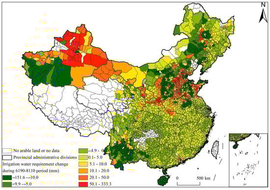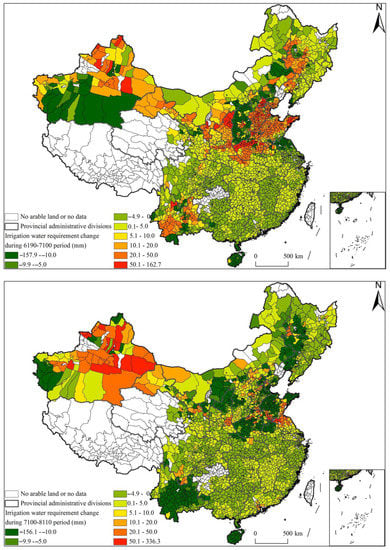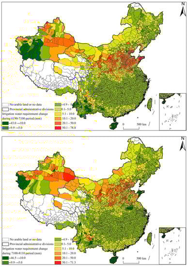 At the county level (Figure 6), the areas with increased IWR were concentrated in northwest and north China, eastern Inner Mongolia and northeastern Sichuan, where water resources are essentially scarce. The impact of climate change on these areas is undoubtedly aggravated by water resource scarcity. However, the IWR in northeast China, south China, central China, southwest Xinjiang and southwest Sichuan has decreased significantly. Regionally, the increase of water requirement due to climate change is more obvious in the north than in the south, and the north is more water deficient than the south.