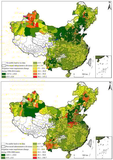 Variation of IWR caused by planting structure change of counties during 1990–2014, 1990–2000 and 2000–2014 periods.
