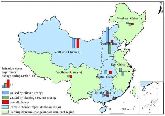 From the relative contribution of climate change and planting structure adjustment (Figure 9), according to the direction of the impact, the change in IWR in China is mainly affected by climate change rather than by planting structure change. In north China and central China, the increase in IWR caused by climate change exceeded the decrease caused by the change in planting structure, and the IWR showed an increasing trend. In northeast China and east China, the decrease in IWR caused by the change in planting structure exceeded the increase in IWR caused by climate change, and the IWR tended to decrease. In south, southwest and northwest China, climate change and planting structure change had the same impact direction on the IWR. Judging by the magnitude of the impact, the change in IWR in south and northwest China was more affected by climate change, while the change in IWR in southwest China was more affected by planting structure change. Therefore, currently, the change in IWR in northeast, east and southwest China was dominated by the change in planting structure, and the direction of the IWR change was toward becoming more water-saving. The change in IWR in north China, south China, central China and northwest China was dominated by climate change. Among these regions, except south China, the change directions of IWR in other areas were all toward water consumption. Nationally, the change in IWR in China is still dominated by climate change, and the overall trend is toward the direction of water consumption. Therefore, adjusting crop planting structure is a promising way to save irrigation water [,].