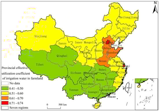 In addition, only the net IWR was studied in this paper. If the effective utilization of farmland irrigation water is considered, the actual gross IWR would be different []. In 2015, the effective utilization coefficient of farmland irrigation water in China was 0.536, and the average gross IWR of the three crops in China was 111.83 mm under the climate conditions of the 8110 period and the crop planting structure in 2014. Regionally (Figure 10), the effective utilization coefficients of farmland irrigation water in each region, from high to low, were 0.62 in north China, 0.58 in east China, 0.57 in northeast China, 0.53 in central China, 0.52 in northwest China, 0.50 in south China and 0.45 in southwest China. The distribution of the effective utilization coefficient of farmland irrigation water was high in the north and east and low in the south and west. The relatively high IWR in the western region will lead to greater actual irrigation water consumption in the western region. The western region itself is an area with water shortages, which will make the local water resource situation more scarce and tense. Meanwhile, water demand can be compared with water resources, and the change in water resource pressure in different regions can be obtained. Furthermore, according to Zhan et al.’s division of the period of the changes in planting structure in rural China, grain crops were mainly planted in rural China from the 1970s to 1990s. High-value-added cash crops began to appear after the 1990s []. At the end of 2015, the Chinese government proposed a structural reform of the agricultural supply side, actively optimizing and adjusting the planting structure. Thus, the next step should be to add the consideration of the effective utilization coefficient of farmland irrigation water, more kinds of grain crops and cash crops and a lengthened time series.