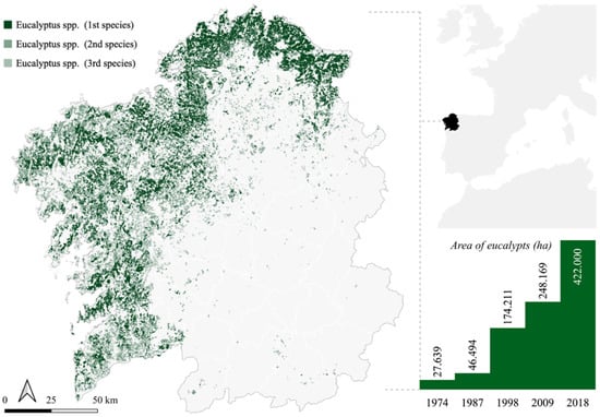 The rapid expansion of Eucalyptus spp. plantations constitutes the greatest process of contemporary forest transformation in the northwest of the Iberian Peninsula [,]. In general, this expansion laid in the transition from a paradigm of public promotion of plantations to another more diffuse, subject to private initiative, and the development of market logic [,]. While data show that most of the current masses are essentially the result of individual initiative, collective questions around the governance of the forest space and the derived effects of monocultures arise. For instance, issues such as the concentration of the population in urban areas and changes in lifestyle have led to an increasingly absent forestry scenario []. In this context, both Portuguese and Spanish governments have recently promoted regulations to landowners and tenants regarding the afforestation with this genus. However, the efforts to revert the so-called eucalyptisation and diversify the forest space have been tagged as ineffective so far [].