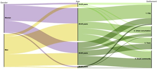 Representation, through an alluvial diagram, of the correlation between gender, age and place of residence of the participating activists. Each rectangle represents a unique value in the selected dimension, and its height is proportional to its value. Figure produced with RawGraphs.