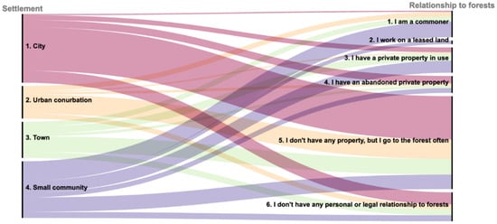 Representation, through an alluvial diagram, of the correlation between the place of residence and the relationships with forests. Figure produced with RawGraphs.