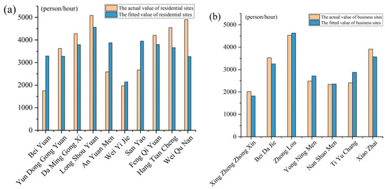 The actual and fitted passenger flow for the peak and off-peak periods of each station is obtained using Equations (6)–(11), as shown in Figure 10a–f, respectively. The trend of the value was basically similar, and the average MAPE values of the three types of sites during peak and off-peak periods were all less than 30%, within an acceptable range (Table 17); therefore, all fitting equations were reliable for ascertaining the correlations between the GFAs and hourly flow. Additionally, they can be employed for forecasting the trend when the flow changes; however, other factors, beyond those pertaining to land, can also impact the hourly flow, and thus, the fitting equations need to be perfected in subsequent research.