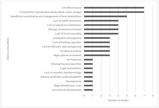 We assessed the previous experience of energy transitions in Mali and Nigeria through a systematic review of the literature. Our results show that multiple drivers can affect the implementation success of energy transition. Figure 2 provides an overview of conflict drivers identified through our literature review. Highlighting these critical variables raises awareness of the complexity of energy transition and informs policymakers and other actors on how to better implement just transitions. The two most reported factors, livelihood issues and competition of production factors are both cited in 7 out of 17 studies. These are followed by insufficient coordination and management of local stakeholders, which is cited in five studies. A detailed description of each of the 20 identified drivers is provided in the following subsections.