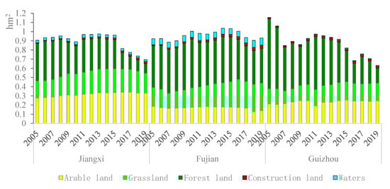 The ecological footprints per capita in Jiangxi, Fujian, and Guizhou from 2005 to 2019 were calculated by Equation (1), and the ecological footprints per capita in the three provinces exhibited the overall characteristics of two declines and one increase (Figure 2).