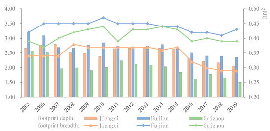 The per capita footprint depth and per capita footprint breadth of Jiangxi, Fujian, and Guizhou were calculated by Equations (4) and (5), respectively (Figure 4).
