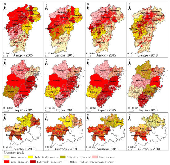 Ecological pressure is an important indicator reflecting the regional LECC security pattern. WWF (World Wildlife Fund International) made a standard ecological pressure index classification in 2004, dividing ecological pressure on arable land, forest land, grassland, water, and construction land into six classes (Table 3). The ecological stress index was calculated by Equation (3), and the calculation results showed that each province’s overall ecological stress index was large, and the LECC security situation was severe. From 2005 to 2019, the average ecological stress index of 26 prefecture-level cities in Jiangxi, Fujian, and Guizhou was greater than 1.0. Among them, the ecological pressure index of five cities is 1.0–1.5, including Ganzhou, Shangrao, Ningde, Zunyi, and Bijie (accounting for 19.23% of the total number of cities), which are in a relatively insecure state; The stress index of seven cities was 1.5–2.0, including Jiujiang, Ji’an, Fuzhou, Nanping, Longyan, Anshun, and Tongren (accounting for 26.92% of the total number of cities), which is a very insecure state. The 14 remaining cities have an ecological pressure index greater than 2.0, including Nanchang, Fuzhou, Guiyang, etc., and account for 53.85% of the total number of cities, which are in a very insecure state.