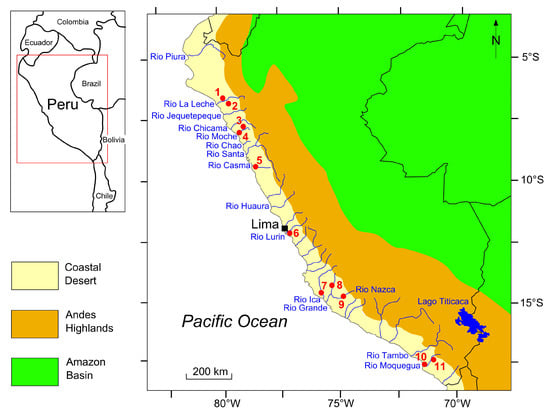 Coastal Peru (330′–1830′ S, 8130′–7030′ W) is one of the driest regions in the world. Such a desert environment results from the SE Pacific anticyclone and the Humboldt Current coming from the Antarctic Sea, because they both prevent rain [32,33]. Annual precipitation values are rather uniform along the entire coast, averaging 10–25 mm per year. The desert along the Pacific is narrow, only about 120 km wide before the land rises into the Andes Highlands, where precipitation increases with elevation. Tens of perennial or seasonal rivers, coming down from the Andes, pass through the desert on the way to the ocean (Figure 1). They allow both biological life and human settlement within and in the surrounding riparian oases. Once every 7–15 years, an El Niño brings warm sea surface temperatures and torrential rainfall on the coastal region, breaking the hyperarid state. Within the last century, severe El Niño events occurred during the years 1925/1926, 1940/1941, 1957/1958, 1972/1973, 1982/1983, 1997/1998, and 2015/2016, the latter with an extraordinary prolongation in 2017 [7,10,34,35,36,37].