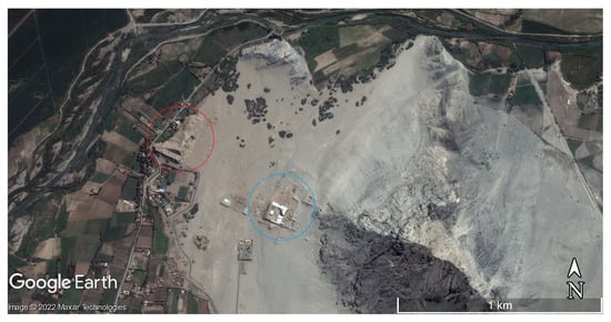 Huacas de Moche; 2004 satellite image (807′25″–808′22″ S, 7900′17″–7858′35″ W). Huaca del Sol and Huaca de la Luna are marked by a red circle and blue circle, respectively. The depositional origin of late Holocene layers covering the plain between the monumental buildings should be ascertained, taking into account the landscape processes argued by the authors [14,83,128].