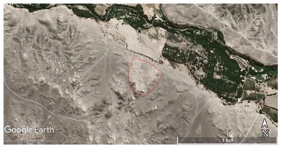 Quebrada Miraflores; 2021 satellite image (1725′49″–1726′36″ S, 7122′22″–7121′42″ W). The extent of the Miraflores Unit according to Satterlee et al. [22] is marked by a red line and the location of Chiribaya settlement by a blue circle (see text).