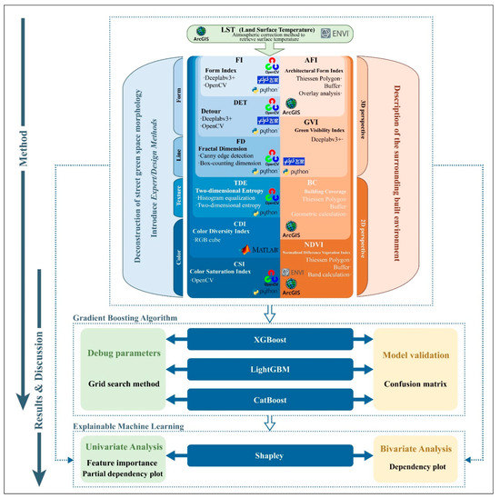 The specific work presented in this paper is shown in Figure 1 and can be considered in three parts. (1) Expert/design theory, using deep learning and computer vision, is employed to obtain the morphological parameters of street green space. (2) The prediction performances of three models (XGBoost, LightGBM, and CatBoost) that use machine learning methods are compared and the best-performing model is selected to explore the nonlinear relationship between the street green spaces morphology and SUHIs. (3) Feature importance rankings, partial dependency graphs, and dependency graphs are used to resolve the prediction models, interpret the impact of each feature on SUHIs, and propose corresponding urban design countermeasures. The study’s objective is to propose a method for quantifying the space morphology of street green spaces, introduce an integrated learning algorithm to resolve the nonlinear relationship between that space morphology and SUHIs, and examine the feedback, influences, and relationships among all features. The above results can be given to urban planners, landscape architects, and decision-makers as a reference for their work and as an applied method for urban physical assessments to assist urban planning and street layout and design.
