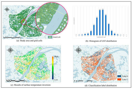 where LSTi is the weighted average surface temperature within grid cell i, n is the total number of temperature value types within grid cell i, Ai is the area of grid cell i (m2), Aij is the area occupied by the jth temperature within grid cell i (m2), and Tj is the surface temperature value of the jth temperature (°C). The visualization of the calculation results is shown in Figure 2c.