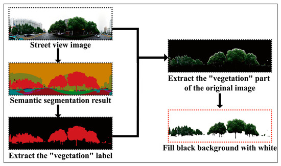 As shown in Figure 3, cars were first removed from the streetscape images (which were 4096 × 1536 pixels in size) to eliminate the interference they cause, and the image size was then reduced to 4096 × 1280 after cropping. Then, the deep learning platform was used to build the deeplabV3+ framework, and the semantic segmentation of the streetscape image was performed based on the city spaces dataset developed by urban research. The city spaces dataset supports classifying street scenes into 19 categories, and in this study, only the segmentation results for the label “vegetation” were retained in the segmentation. The corresponding vegetation parts in the street scene images were extracted based on the labeled images using OpenCV, and the other portions of the images were filled with white (RGB = 255, 255, 255).