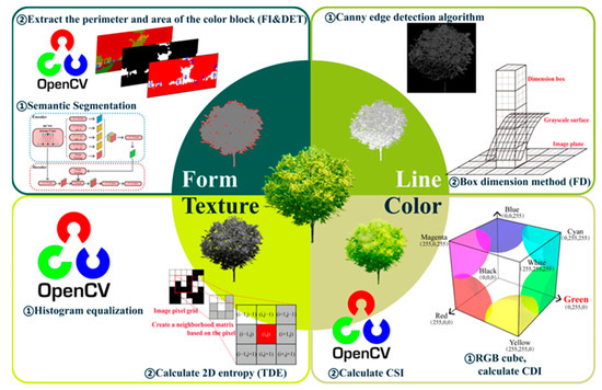 From the perspective of information gain, obtaining the main contour features of the image can achieve the purpose of identifying the target object, and the other internal lines added afterward only achieve a detailed description and do not contribute to the recognition of the object itself [36]. This view fits well with the semantic segmentation principle of deep learning [48]. Therefore, for the description of morphological characteristics, we processed the semantic segmentation of the images through the OpenCV framework to obtain the color block perimeter and area values and calculate the FI (form index) and DET (degree of detour) to describe the vegetation geometry. Because all vegetation is largely coherent, there may only be one “vegetation” label color block in the calculation of the FI, resulting in a calculation result of 0. The reason for adding the DET is to supplement the defect of the FI calculation method. The other details of the object are described in the following sections with regard to lines, texture, and color.