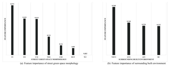 The variables were divided into two groups: street green space morphology and surrounding built environment. Figure 6 shows the scores and ranking of the features importance of each variable.