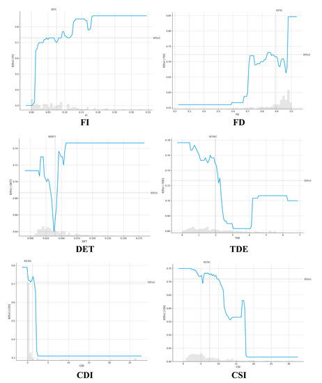 Figure 7 shows the partial dependency plot (PDP) of each variable against LST, with the horizontal coordinates indicating the incremental changes in the independent variables, while the vertical coordinates indicate the incremental changes in LST. The overall positive correlation between FI and LST implies that vegetation communities with complex geometry are less effective in cooling, which is consistent with previous studies [9,26,33,47,59]. At lower FIs (0–0.03), the tree canopy or shrub geometry is usually simpler, with larger shaded areas or more concentrated shaded areas, and therefore LST is relatively lower. However, when FI gradually increases (0.03–0.20), the relationship between FI and LST shows relatively obvious fluctuations, although it is still positively correlated. According to the calculation of FI, the increase in FI not only means that the vegetation geometry is complex but also that the number of color blocks of the vegetation labels in the semantic segmentation image may increase. This type of plant arrangement usually indicates the absence of vegetation in a section of road. Or it may indicate newly planted trees along a roadway due to their small canopy and the existence of gaps between trees in the streetscape image, which leads to incoherent green spaces [60] and increases the number of independent color blocks of the vegetation labels. Thus, this more complex relationship could potentially lead to variable cooling effects. As with FI, an increase in DET implies a more complex geometry, thus, DET shows an overall positive trend with LST, but when DET is between 0.025–0.05, LST decreases significantly.
