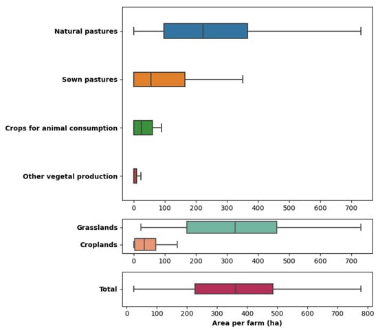 The land use class with the largest variation (interquartile distance) in area between farms is the natural pastures class, i.e., about 270 ha, while the class with the lowest variation is the other plant production class, with only 10 ha. The interquartile distances of sown pastures and crops for animal consumption are 165 ha and 61 ha, respectively. Due to the higher variation of both pasture systems in comparison with the variation of crops production classes, the aggregated land use classes of grassland have a significantly higher variation than of croplands, with interquartile distances of 288 ha and 67 ha, respectively.