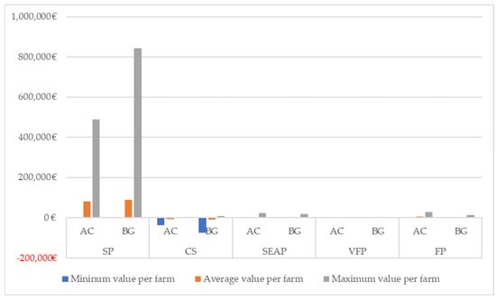 Graphical comparison of the economic values of each ecosystem service per farm. SP—Soil protection; CS—Carbon sequestration; SEAP—Support to extensive animal production; VFP—Vegetal food production; FP—Fiber production; AC—Approach by average class; BG—Buffer generation.