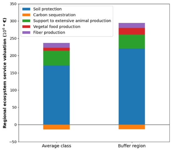 From national statistics, the area of permanent pastures in the region is 1,151,238 ha []. If this area corresponds to grasslands and dehesa, and the proportion of land uses verified on the dataset applies, there is an estimated area of 112,305 ha of croplands associated with PBBF in Alentejo. Taking these areas into consideration and applying them together Equation (5) with the TEV presented in Table 5, we arrive at the regional results presented in Figure 4, for the class approach. The results for BG are obtained directly from each ES value multiplied by the total area considered for Alentejo.